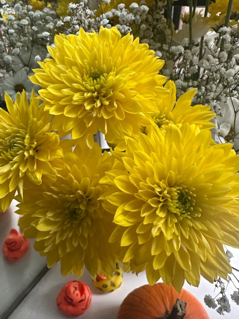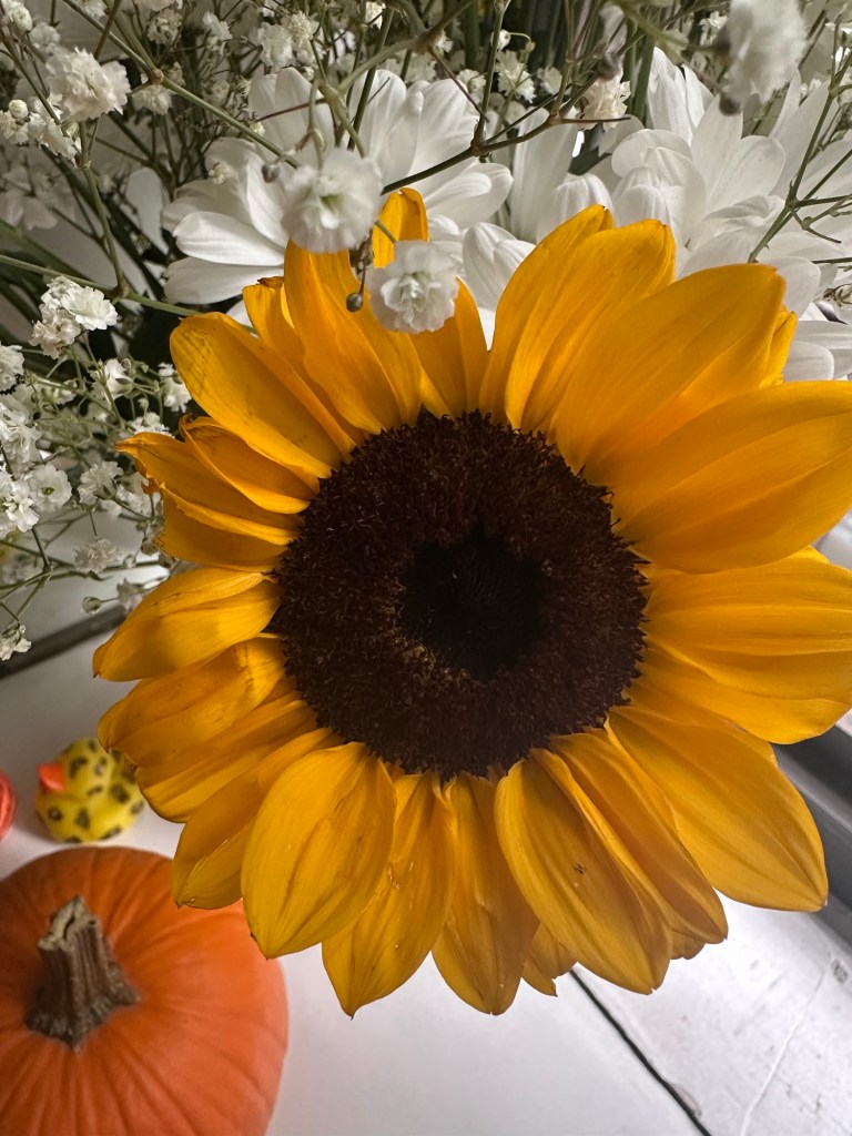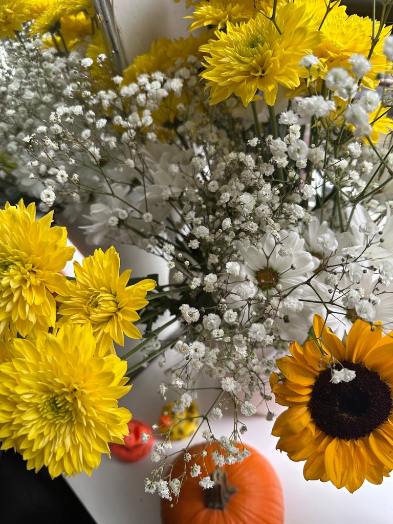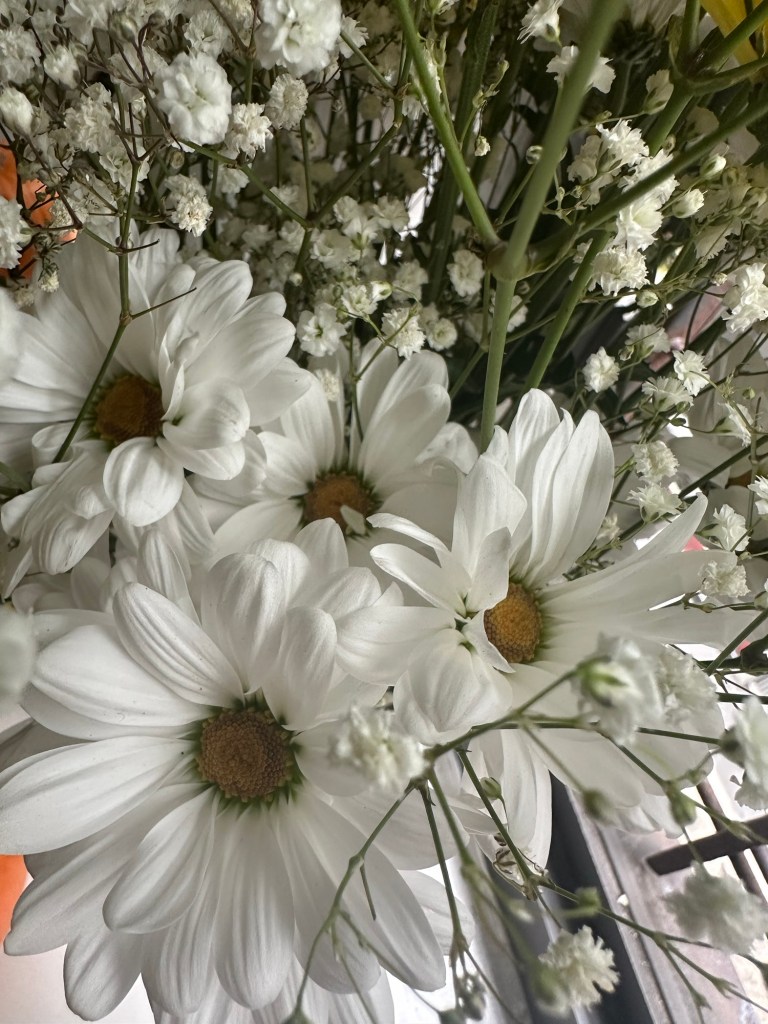 En la esquina junto a la ventana, ella deja el jarrón como quien deja una carta de luz. Tres tonos de amarillo se entrelazan: el amarillo profundo del girasol, el amarillo puro de las margaritas pomposas y el botón de la margarita, pequeño y perfecto, guarda un amarillo concentrado —un punto de sol en miniatura— que atrae la mirada y sostiene la sonrisa. Entre ellas, pequeñas florecitas blancas —esas que no necesita nombrar para sentirse— llenan los huecos con puntitos de luna, ternura que hace respirable el conjunto.